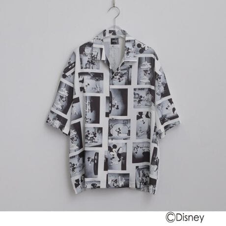 短編アニメーション「ミッキーの夢物語」のワンシーンをフィルムのようにコラージュし、全面にプリントした総柄シャツ。