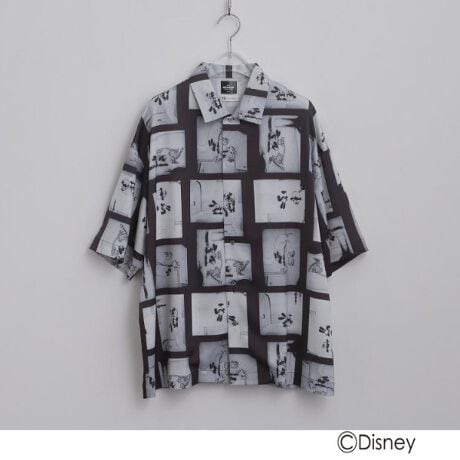 短編アニメーション「ミッキーの夢物語」のワンシーンをフィルムのようにコラージュし、全面にプリントした総柄シャツ。