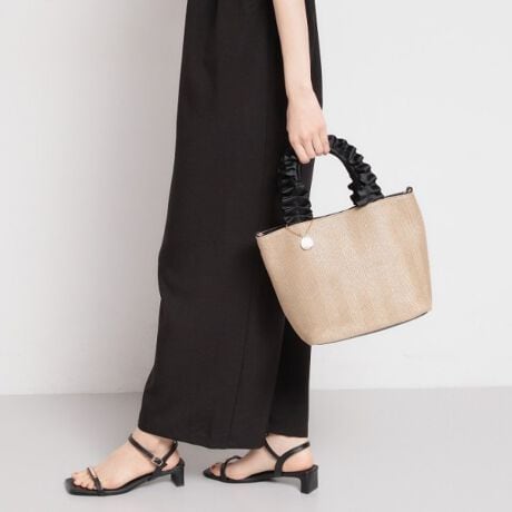 雑材ボディにサテンのフリル持ち手を効かせた愛らしいトート。