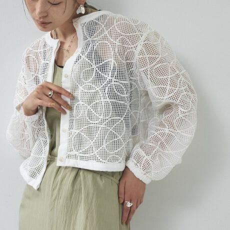 透け感のあるメッシュに立体的な刺繍ラインを配したショートブルゾン。