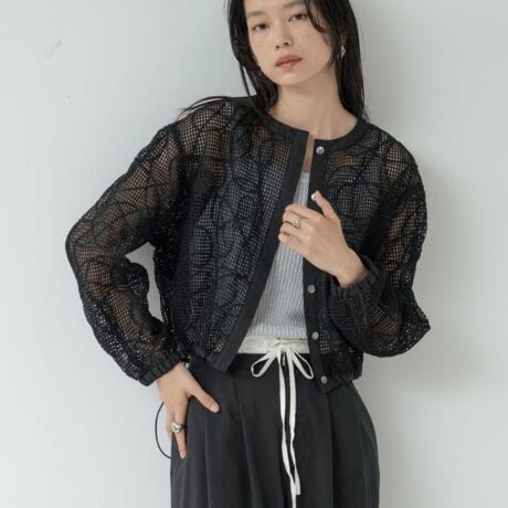 透け感のあるメッシュに立体的な刺繍ラインを配したショートブルゾン。