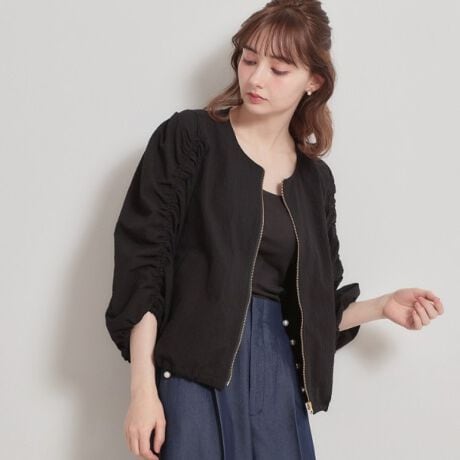 シャーリングスリーブが目を惹くノーカラーブルゾン。
