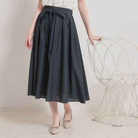 タック&ギャザーデザインで腰回りのボリュームを程良く抑えて、ふんわりシルエットを実現した、キレイ目スカート