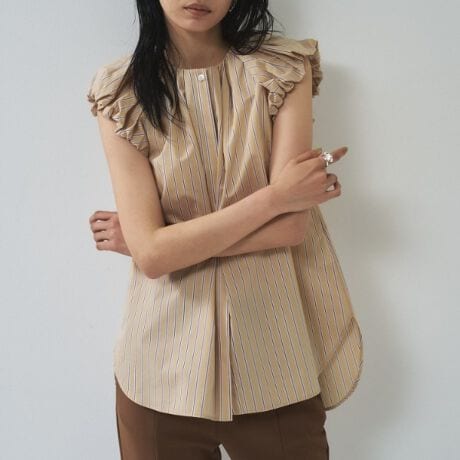 肩のフリルが印象的なノースリーブブラウス。