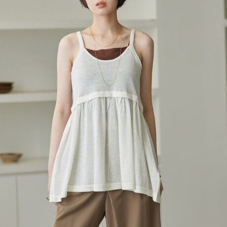 胸元はすっきりとしたスクープネック、細いストラップで軽やかな印象のニットキャミ。