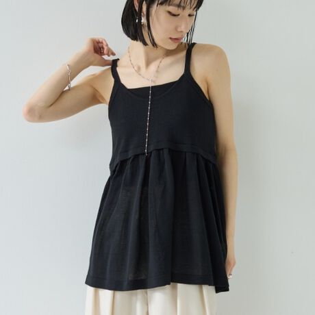 胸元はすっきりとしたスクープネック、細いストラップで軽やかな印象のニットキャミ。