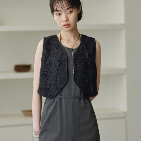 フロントの繊細なレース刺繍が主役のショートジレ。