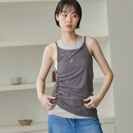 サイドに寄せたシャーリングで生まれるランダムなドレープが特徴のレイヤードタンク。
