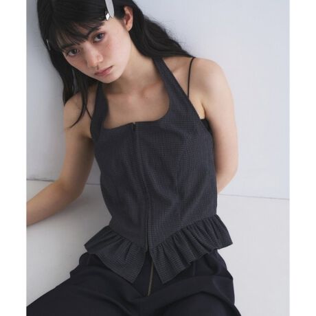 フロントのジップディテールが目を引く、エッジでモダンなホルターネックビスチェ。