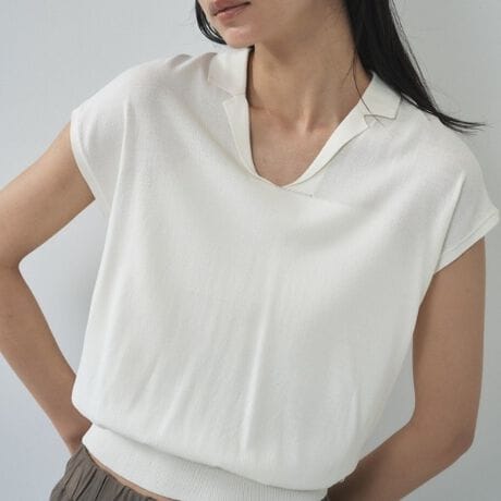 小さめの開き衿とスキッパーネックですっきり見せたシアーニット。