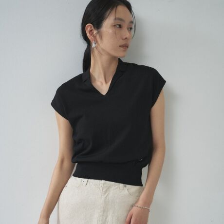 小さめの開き衿とスキッパーネックですっきり見せたシアーニット。