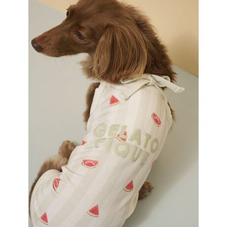 夏の気分を盛り上げるカラフルなストライプ柄に、弾けるフルーツをプリントしたCAT&DOGシリーズです。スイムウェア風のキュートなデザインで仕上げた、ひんやり心地良い接触冷感素材のダックスフンド用プルオーバー。背丈が長めのシルエットに、発泡プリントのぷっくりしたブランドロゴをあしらい、キャッチーに仕上げました。背中に保冷剤が入るポケット付きで、首元のリボンは洗濯がしやすいように解ける仕様になっています。色はラズベリー柄のピンク、スイカ柄のグリーンの2色展開。同シリーズの雑貨と組み合わせたり、きょうだいで色違いのコーディネートもおすすめです。