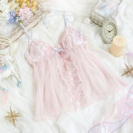 ペガサスとバンビが舞い踊る、夢の世界をイメージしたルームシリーズです。キラキラと降り注ぐ星や鮮やかな虹が織りなすレースで、まるで夢の中のようなロマンティックな可愛らしさに仕上がりました。カップ上辺と身生地にはギャザーチュールをふんだんにあしらい、ふわふわとしたディテールで世界観を後押し。お揃いの刺繍レースを縦にあしらい、豪華な印象をプラスしました。リボン中央に添えた立体的な月のチャームは、動くたびにラインストーンがきらめき、特別感を演出します。身に着けるだけで日常にちょっと魔法をかけるような、女の子の心ときめくコレクションです。