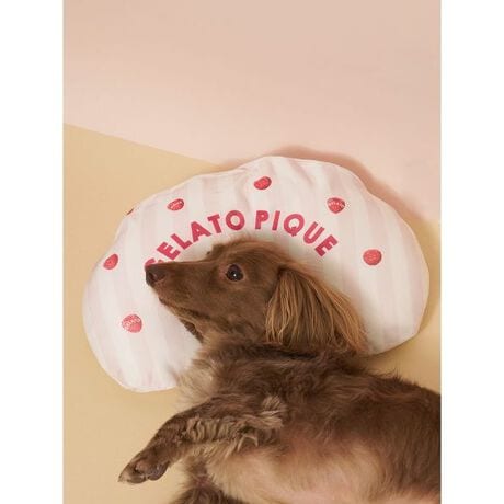 夏の気分を盛り上げるカラフルなストライプ柄に、弾けるフルーツやアイス柄をプリントしたCAT&DOGシリーズです。暑い時期にもひんやりふわふわの肌触りをお届けする、接触冷感のカットソー素材を使用した夏向けピロー。抗菌防臭加工も施しています。小型犬や猫におすすめの小さなサイズ感で、アクセントに大きなロゴプリントを入れました。カバーを取り外すことができるので、汚れが気になったら手軽にお洗濯していただけます。色はラズベリー柄のピンク、グレープフルーツ柄のイエロー、スイカ柄のグリーン、アイス柄のブルーの4色展開。同シリーズのプルオーバーや雑貨と組み合わせたり、きょうだいで色違いのコーディネートもおすすめです。