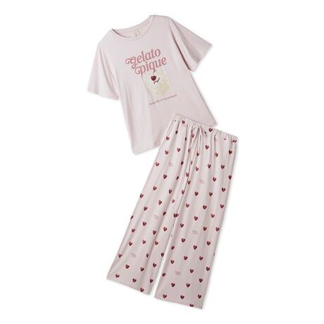「胸がきゅんとする」をコンセプトにデザインした、ハートモチーフのONLINE限定セットアップ。ハート型のいちごショートケーキをプリントしたレーヨンTシャツと、ハート柄に配色のロゴを効かせた甘すぎない絵柄のロングパンツを組み合わせました。いずれもひんやりとした肌触りがお楽しみいただける、なめらかな接触冷感素材を使用。生クリームたっぷりを添えたケーキの下には、「胸きゅん」を意味する英語をプリントしています。パンツは両脇にポケット付きで機能的に仕上げました。色はオフホワイト、ピンク、ブルーの3色展開。同シリーズの雑貨と合わせたり、ギフトにもおすすめのアイテムです。