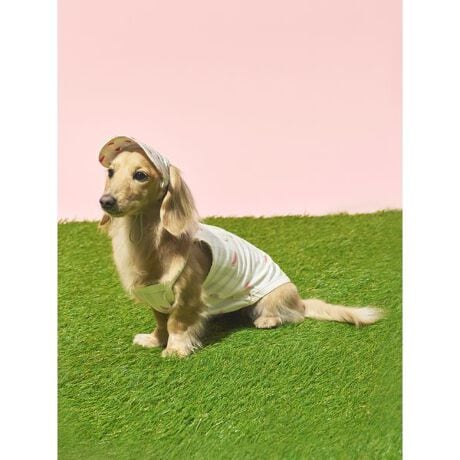 夏の気分を盛り上げるカラフルなストライプ柄に、弾けるフルーツをプリントしたCAT&DOGシリーズです。おしゃれしながら、夏の日差しや暑さから守ってくれるキュートなサンバイザー。調整可能な顎紐も付いているので、毎日のお散歩に手軽にご使用いただけます。色はラズベリー柄のピンクとスイカ柄のグリーンの2色展開。同シリーズのプルオーバーと合わせたり、きょうだいで色違いのコーディネートもおすすめです。