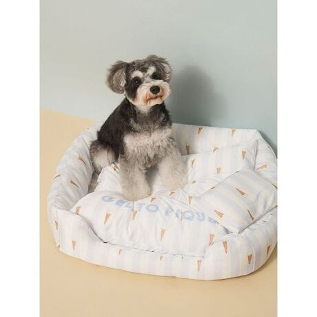 夏の気分を盛り上げるカラフルなストライプ柄に、弾けるフルーツやアイス柄をプリントしたCAT&DOGシリーズです。暑い時期にもひんやりふわふわの寝心地をお届けする、接触冷感のカットソー素材を使用した夏向けのベッド。抗菌防臭加工も施しています。やや大きめのMサイズは、中型犬や多頭飼いの方にもおすすめの大きさです。大きなロゴプリント入りのキャッチーなデザインで、小さなクッションも付属。カバーを取り外すことができるので、汚れが気になったら手軽にお洗濯していただけます。色はラズベリー柄のピンク、アイス柄のブルーの2色展開。同シリーズのプルオーバーや雑貨と組み合わせてお楽しみください。