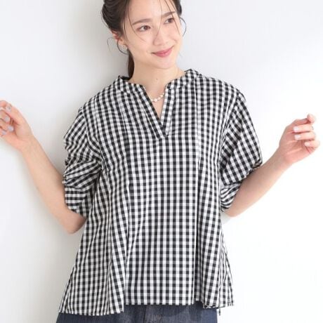 首元は程よく抜け感のあるスキッパーデザインで、顔まわりをすっきり見せてくれる1枚。
