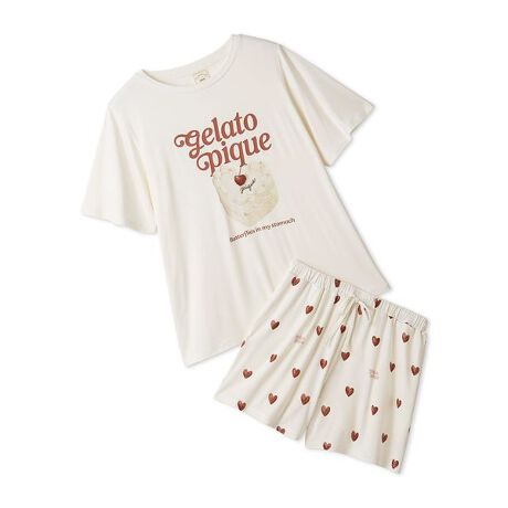 「胸がきゅんとする」をコンセプトにデザインした、ハートモチーフのONLINE限定セットアップ。ハート型のいちごショートケーキをプリントしたレーヨンTシャツと、ハート柄に配色のロゴを効かせた甘すぎない絵柄のショートパンツを組み合わせました。いずれもひんやりとした肌触りがお楽しみいただける、なめらかな接触冷感素材を使用。生クリームたっぷりを添えたケーキの下には、「胸きゅん」を意味する英語をプリントしています。パンツは両脇にポケット付きで機能的に仕上げました。色はオフホワイト、ピンク、ブルーの3色展開。同シリーズの雑貨と合わせたり、ギフトにもおすすめのアイテムです。