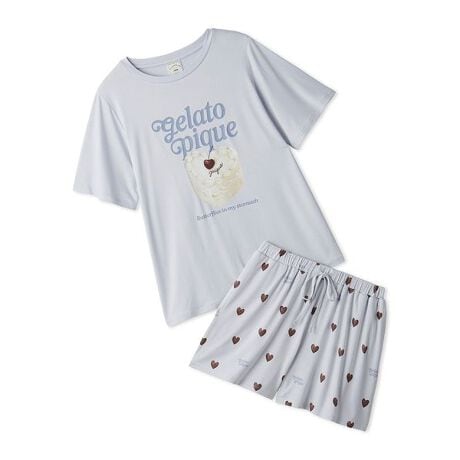 「胸がきゅんとする」をコンセプトにデザインした、ハートモチーフのONLINE限定セットアップ。ハート型のいちごショートケーキをプリントしたレーヨンTシャツと、ハート柄に配色のロゴを効かせた甘すぎない絵柄のショートパンツを組み合わせました。いずれもひんやりとした肌触りがお楽しみいただける、なめらかな接触冷感素材を使用。生クリームたっぷりを添えたケーキの下には、「胸きゅん」を意味する英語をプリントしています。パンツは両脇にポケット付きで機能的に仕上げました。色はオフホワイト、ピンク、ブルーの3色展開。同シリーズの雑貨と合わせたり、ギフトにもおすすめのアイテムです。