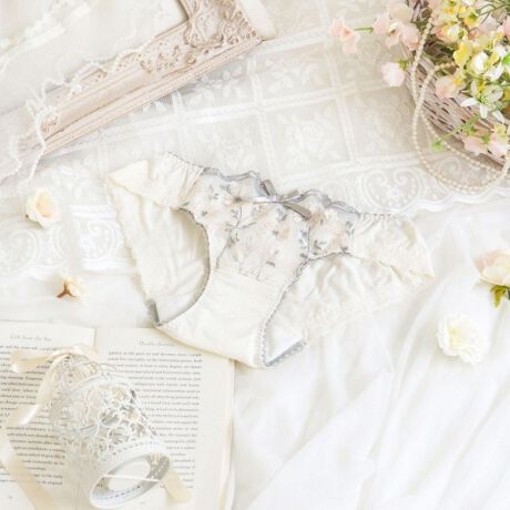 野に咲く花々を立体的に咲かせた、可憐なシリーズです。繊細に刺繍された花々には立体感のあるパッカー手法をほどこして、可愛らしく動きのある印象に。レース上辺にはアーチのような幾何学模様をあしらい、クラシカルな上品さもプラスしています。まるでお花が風に吹かれて舞っているような、新しい季節の訪れを感じるコレクションです。