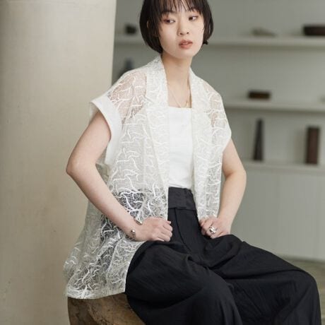 繊細な刺繍糸が立体的に浮かぶシアーメッシュは、動くたびに表情を変えるアウターです。