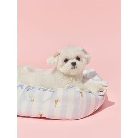 夏の気分を盛り上げるカラフルなストライプ柄に、弾けるフルーツやアイス柄をプリントしたCAT&DOGシリーズです。暑い時期にもひんやりふわふわの寝心地をお届けする、接触冷感のカットソー素材を使用した夏向けのベッド。抗菌防臭加工も施しています。小さめのSサイズは、小型犬や猫におすすめの大きさです。大きなロゴプリント入りのキャッチーなデザインで、小さなクッションも付属。カバーを取り外すことができるので、汚れが気になったら手軽にお洗濯していただけます。色はラズベリー柄のピンク、アイス柄のブルーの2色展開。同シリーズのプルオーバーや雑貨と組み合わせてお楽しみください。