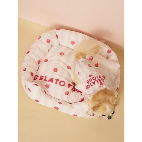 夏の気分を盛り上げるカラフルなストライプ柄に、弾けるフルーツやアイス柄をプリントしたCAT&DOGシリーズです。暑い時期にもひんやりふわふわの寝心地をお届けする、接触冷感のカットソー素材を使用した夏向けのベッド。抗菌防臭加工も施しています。小さめのSサイズは、小型犬や猫におすすめの大きさです。大きなロゴプリント入りのキャッチーなデザインで、小さなクッションも付属。カバーを取り外すことができるので、汚れが気になったら手軽にお洗濯していただけます。色はラズベリー柄のピンク、アイス柄のブルーの2色展開。同シリーズのプルオーバーや雑貨と組み合わせてお楽しみください。
