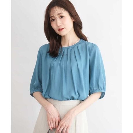前身頃にタックを入れて立体感を出した人気素材のブラウス。涼しげな衿ぐり、袖幅もゆったりとさせて、暑くなる季節も涼しげに着こなせるデザインです。肘がちょうど隠れる袖丈は上品で大人な印象にぴったり。