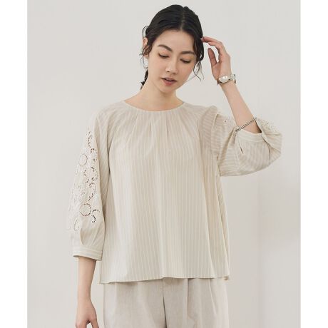 立体パフ袖と刺繍で魅せる上品フェミニンブラウス■デザイン立体感のあるパフスリーブに、カットワーク刺繍を施したプルオーバーブラウスです。程よくゆとりのあるAラインシルエットで、気になる腰まわりをさりげなくカバー。さまざまなボトムスと合わせやすいバランスで、女性らしい華やかさを演出します。後ろ襟ぐりは、タッセル付きスピンドルを結ぶ仕様がさりげないアクセントになっています。■素材セルロース系再生繊維と綿を使用した、しなやかな風合いと程よい光沢感が魅力の素材です。滑らかなタッチで肌触りが良く、夏に向けて快適な着心地に仕上げています。ストライプ柄は自由区オリジナルです。先染めならではの美しい表情が引き立つよう、無地とは異なる設計で織り上げ、しなやかさを保ちながら、すっきりとした印象のストライプ素材に仕上げました。■同素材バンドカラーブラウス(BLWRLM0404)ワンピース(OPWRLM0404)