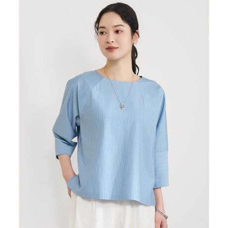 1枚でサマになるブラウス感覚のストライプカットソー■デザインストライプ柄を活かした縦横の切り替えが目を引く、ブラウスライクなカットソーです。シンプルで着回しやすいデザインをベースに、袖にはさりげなくフォルム感を持たせ、程よいアクセントをプラスしました。1枚で着映えしつつ、きれいめにもカジュアルにも対応できるバランスの良い一着です。■素材超長綿のコンパクトヤーンを毛羽立ちを抑えた紡績方法で仕立て、ポリエステル糸と交織した特注素材です。高密度に編み立てた後、生地加工を重ねることで、布帛のようなきれいな表面感に仕上げました。なめらかな肌触りと適度なハリ感を併せ持ち、接触冷感機能付きで快適な着心地も魅力です。