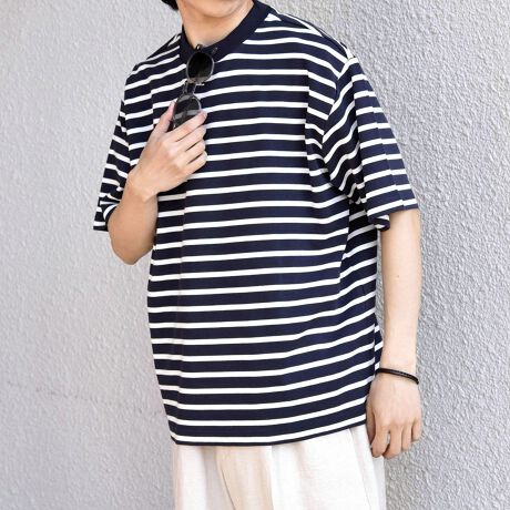 襟リブ部分に編みで柄を表現し、さりげないアクセントをプラスしたボーダーTEE。