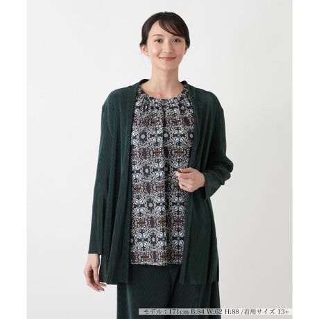 「Leilian WHITE LABEL」の「プリーツセットアップ」シリーズより、軽やかな羽織ブラウスをお届けします。繊細なプリーツ加工が施された生地は、動くたびに美しい陰影を生み出し、エレガントな雰囲気を演出します。さっと羽織るだけで、いつものコーディネートが華やかで洗練された印象に早変わり。前を開けてラフに着こなしたり、ボタンを留めてブラウスとして着用したりと、着こなしの幅が広がります。ご自宅でお手入れしやすい素材なので、旅行先での羽織りものとしても重宝します。同シリーズのアイテムと合わせれば、より一層統一感のある装いが楽しめます。