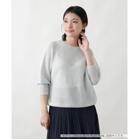 ペーパー素材にポリエステルをブレンドして編み込んだ、清涼感のあるさらりとした肌触りとナチュラルな表情が魅力のミックスニットプルオーバーです。シンプルなクルーネックと浅めのVネックの前後2WAY仕様になっており、その日の気分やコーディネートに合わせて楽しめます。絶妙な丈感でボリュームのあるワイドパンツからフレアスカートまで、ボトムスを選ばずバランスよく合わせやすい着回し力抜群のトップスです。