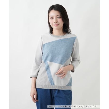 グラフィカルなカラーブロックデザインが目を惹く、コットン混素材のクルーネックニットプルオーバーです。大胆な配色の切り替えがモダンなアクセントを加え、一枚で主役級の存在感を放ちます。軽やかなクロップドスリーブは手元をすっきりと見せつつ、女性らしい絶妙な抜け感を演出。柔らかな肌当たりのニットで着心地もよく、カジュアルからきれいめまで幅広いスタイリングを新鮮にアップデートしてくれる大人顔のトップスです。