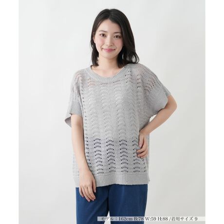 煌めくスパンコールを贅沢に編み込んだ、透かし編みのニットトップスです。繊細かつウェービーな編地が華やかなニュアンス。麻にコットンをブレンドしたニットは、ナチュラルな風合いがありながらも柔らかな肌触りが魅力です。ドロップショルダーと程よくゆとりのあるシルエットが大人のリラックス感を演出。カジュアルなデニムからきれいめのスカートまで、幅広いボトムスを格上げしてくれる主役級のアイテムです。