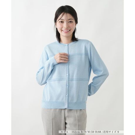 煌めくラメを編み込んだ、華やかな表情のカーディガンです。フロントや袖に施した繊細な透かし編みのボーダーラインが軽やかな抜け感とリズムを与えます。上品な光沢感がありながら、柔らかな編み地で着心地も快適。羽織りとしてはもちろん、ボタンを閉じてプルオーバーのように着こなすのもおすすめです。カジュアルなデニムからきれいめのスラックスまで、幅広いボトムスとのコーデを格上げしてくれる一枚です。