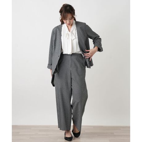 マニッシュなチェック柄が目を惹く、スタイリッシュなパンツです。コーディネートの主役になるデザインでありながら、落ち着いた色調で品良くまとまるのが大人の女性に嬉しいポイント。ウエストはゴム仕様で、リラックス感のある快適な穿き心地を実現しました。同素材のジャケット(品番:1600990)と合わせれば、統一感のあるセットアップスタイルが完成し、お洒落上級者の風格を演出できます。もちろん単品でも着回し力は抜群。シンプルなニットやブラウスと合わせるだけで、こなれた印象のコーディネートが楽しめます。ご自宅で手軽にお手入れができる点も、日々の着用に便利です。