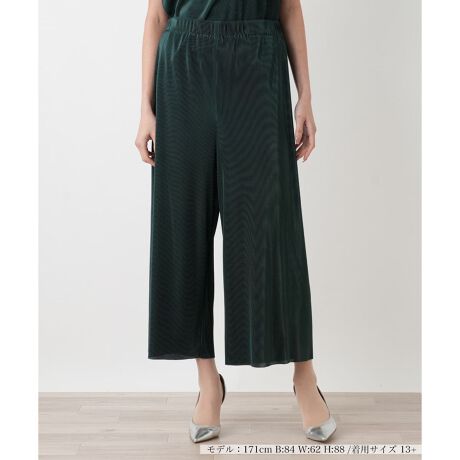 風をはらんで涼やかに揺れる、「Leilian WHITE LABEL」の「プリーツセットアップ」シリーズのガウチョパンツ。スカートのようなエレガントな見た目と、パンツの動きやすさを両立したアイテムです。繊細なプリーツ加工が、歩くたびに美しいドレープを生み出します。ウエストはゴム仕様で、リラックスした穿き心地。裏地付きなので透ける心配もありません。同シリーズのブラウスと合わせれば、ワンピース見えする上品なセットアップスタイルに。シンプルなTシャツやサマーニットと合わせても素敵です。ご自宅で手洗い可能なイージーケア仕様で、夏のワードローブに大活躍します。