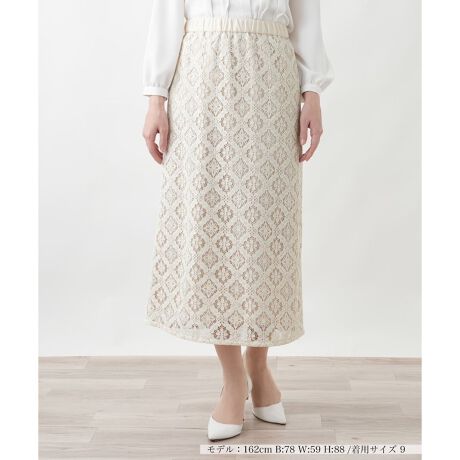 繊細なレースを贅沢に使用した、大人フェミニンな表情のロングスカートです。腰やヒップ回りはすっきりと仕上げ、裾に向けて緩やかに広がるシルエットが女性らしい佇まいを演出。ウエストは総ゴム仕様でストレスフリーな穿き心地を実現しました。バックスリットを入れることで足捌きも良く、歩くたびに軽やかな動きが生まれます。同素材のジャケットと合わせたセットアップはもちろん、単品でも華やかな装いを叶える一枚です。