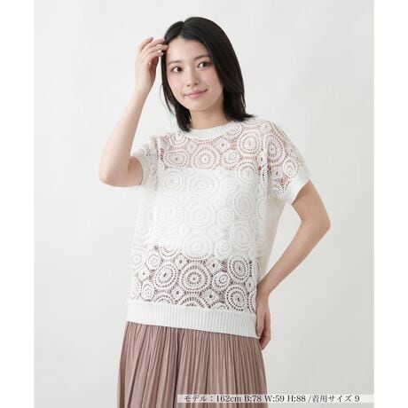 幾何学模様の透かし編みをフロントに配した、清涼感溢れる佇まいのクルーネックニットトップスです。麻にコットンをブレンドしたニットは、さらりとした爽やかな肌触りとナチュラルな風合いを楽しめます。バックや袖はシンプルな天竺編みで切り替えているため、甘くなりすぎず上品に決まります。キャミソールやタンクトップといったインナーとのレイヤードに奥行きをプラスしてくれるアイテムです。