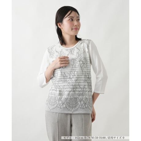フロントに施された繊細なボタニカルレースの模様が、エレガントな表情を演出するクルーネックニットトップスです。淡いボーダーとレースを重ねることで、奥行きのある洗練されたデザインに仕上げました。手首が覗く七分袖は全体の印象をすっきりと見せ、春夏のコーディネートに爽やかな抜け感をプラス。柔らかく肌当たりのよいコットンブレンドのニット素材を使用しており、軽やかで優しい着心地を叶えます。