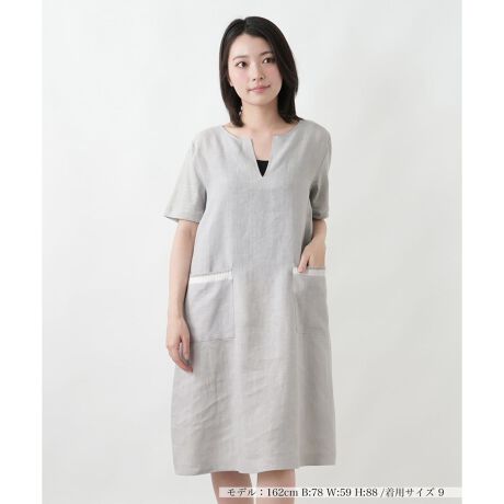 麻をベースとしたさらりとした素材感が、季節らしいナチュラルな風合いと清涼感を演出するキーネックサックワンピースです。顔周りをすっきりと見せるキーネックとリラックス感のあるサックシルエットが相俟って、大人の女性らしいこなれた雰囲気の着こなしを叶えます。両サイドのポケット口にあしらわれたスパンコール入りのリブが程よいアクセントになり、全体の印象を上品に引き締めます。一枚でサマになる存在感がありながら、合わせるボトムスやインナーを選ばないアイテムです。