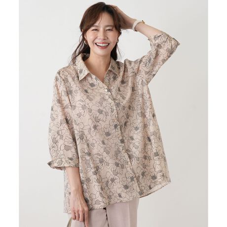 縦のラインに、まるで手で描いたような花模様を重ねたデザインが印象的です。ほのかに透ける軽やかな生地は、体の動きに合わせてやさしく揺れ動きます。きちんと感のある襟付きのデザインながら、身幅にはゆとりを持たせているため、堅苦しくない装いに仕上がります。前を開けて、軽やかな羽織りものとして着るのもおすすめです。