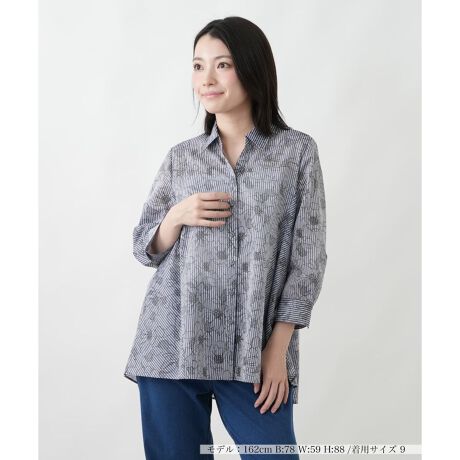 繊細なナローストライプに、エレガントなボタニカル柄を重ねた主役級のブラウスです。軽やかな風合いの生地が女性らしさを引き立て、ゆったりとしたシルエットがこなれた印象を演出。長めの着丈はヒップラインをさりげなくカバーし、クロップドスリーブが抜け感のあるスタイルへと導きます。シンプルなボトムスと合わせるだけで、ひと味違った大人のカジュアルルックを叶えてくれるアイテムです。