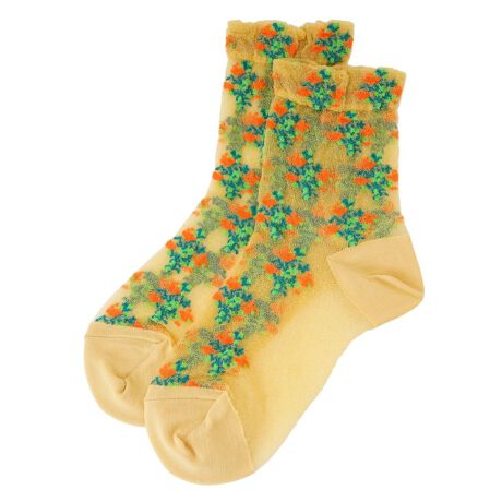 透け感のある軽やかな生地に、ふっくらとした花模様が浮かび上がるように編み込まれています。立体感のある柄が、足元に華やかさと愛らしい表情を添えてくれます。つま先やかかと、履き口は異なる編み地に切り替えることで、デザインにアクセントを加えています。パンプスやサンダルとの組み合わせで、繊細な柄と透け感を存分に楽しめる一足です。