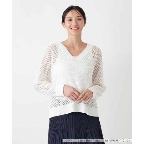 柔らかな風合いと洗練されたデザインが魅力の、イタリアブランド「TRICOT PERUGIA」の長袖プルオーバー。肌馴染みの良いコットン素材を使用した、リラックス感のある着心地が特徴です。ドロップショルダーのVネックに斜めに走るファンシーな透かし編みが映え、カジュアルながらも上品な印象を与えます。同系色のキャミソールをインナーに忍ばせ、ホワイトやベージュのパンツと合わせると、ニットの持つナチュラルな魅力が引き立ちます。大人の休日にふさわしい、品の良いカジュアルスタイルを叶える一着です。