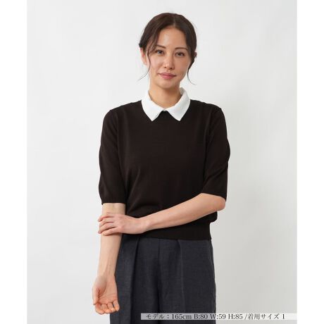 襟付きのデザインがクラシカルな印象を与えるクロップドスリーブトップスです。レーヨンにナイロンをブレンドした素材で、滑らかな肌触りと適度なストレッチ性が快適な着心地を叶えます。コントラストの効いた襟はすっきりとした首元を演出しつつ、型崩れしにくいのも嬉しいポイント。程よいフィット感のあるシルエットが身体のラインをきれいに見せ、きれいめなスカートからカジュアルなデニムまで幅広いボトムスと好相性のアイテムです。