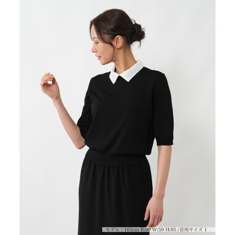 襟付きのデザインがクラシカルな印象を与えるクロップドスリーブトップスです。レーヨンにナイロンをブレンドした素材で、滑らかな肌触りと適度なストレッチ性が快適な着心地を叶えます。コントラストの効いた襟はすっきりとした首元を演出しつつ、型崩れしにくいのも嬉しいポイント。程よいフィット感のあるシルエットが身体のラインをきれいに見せ、きれいめなスカートからカジュアルなデニムまで幅広いボトムスと好相性のアイテムです。