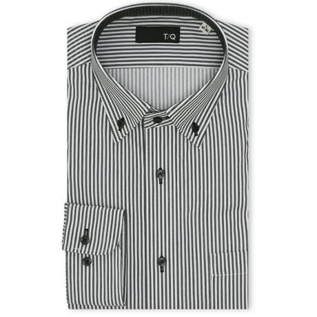 モノトーンのストライプ柄です。衿型はアンタイド(ノーネクタイ)でも衿立ちよく収まり、オフィスカジュアルにもぴったりなボタンダウンを採用しています。タイドアップには、結び目が小さくすっきりとした印象のプレーンノットが好相性です。下前立のデザインテープがアクセントになっています。